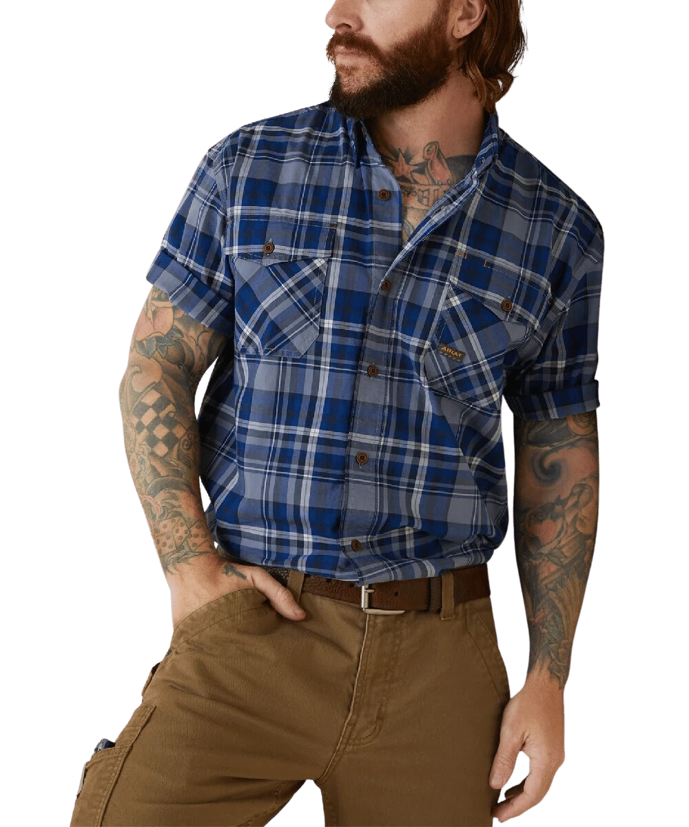 97% Cotton/3% Spandex, 5 Oz. DuraStretch Yarn Dye; Short Sleeve; Button Down Collar; Two Button Flap Pockets; Hidden Microfiber Lens Cloth On Shirt Tail; Drop Tail Hem; Greater Arm Mobility Seam Construction For Maximum Range Of Motion; Moisture Movement Technology wicks Moisture Away From Skin; Color: Stonewash Plaid; Style #10043489