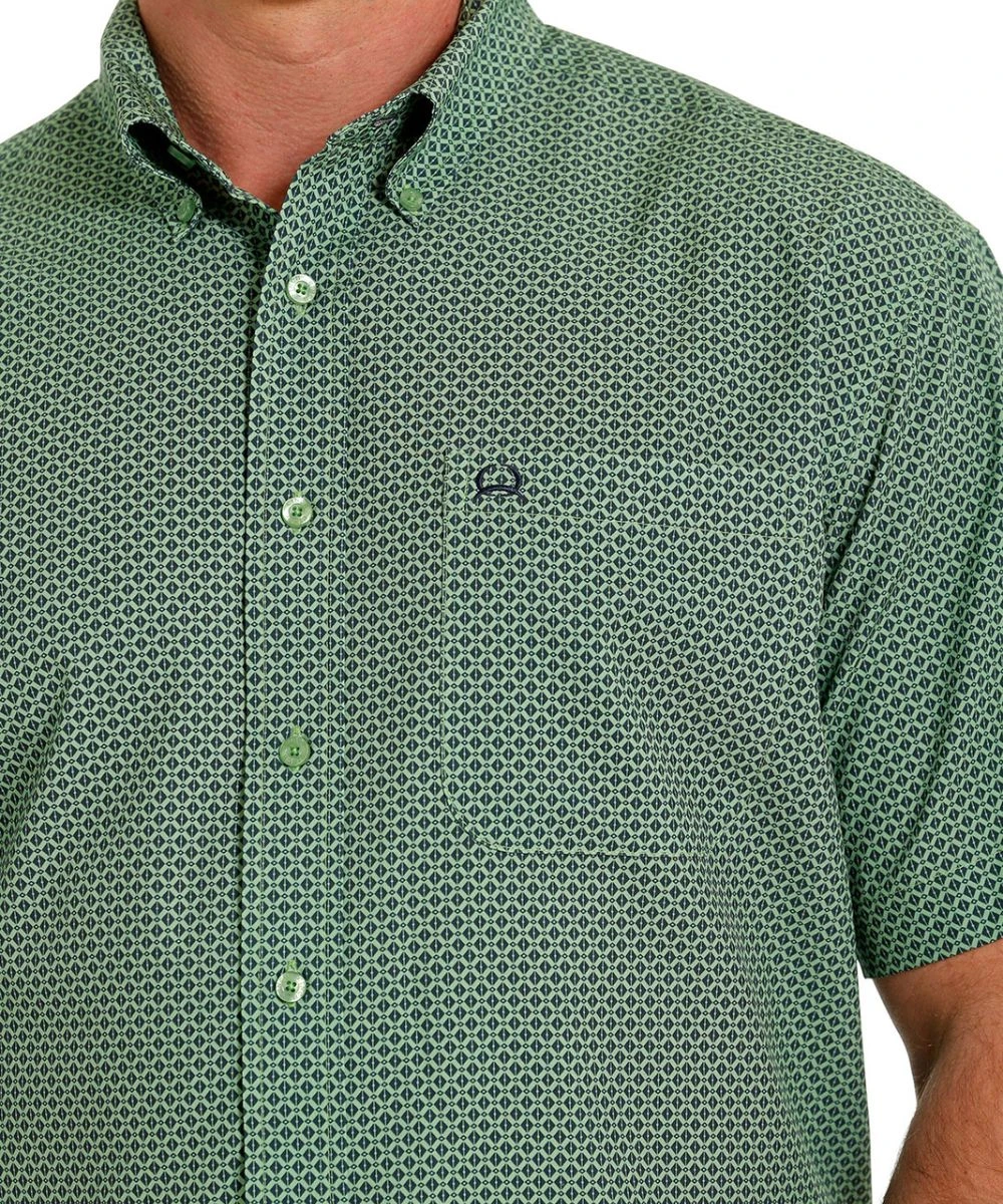 Lightweight Printed Poly/Spandex; Short Sleeve; Button Down Collar And Placket; Green Buttons; Single Open Chest Pocket With Logo Embroidery; Color: Green Geo Print; Size: 3XL; Style #MTW174117X