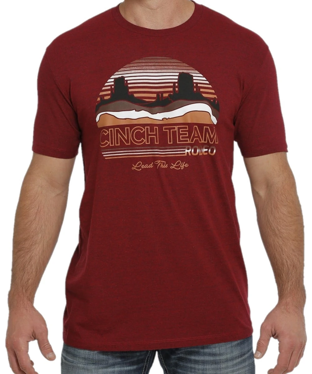 60% Cotton/40% Polyester; Crew Neck; Jersey Style Tee; Short Sleeve; Scenic Western Graphic Print On Front; Color: Heathered Red; Style #MTT1690515