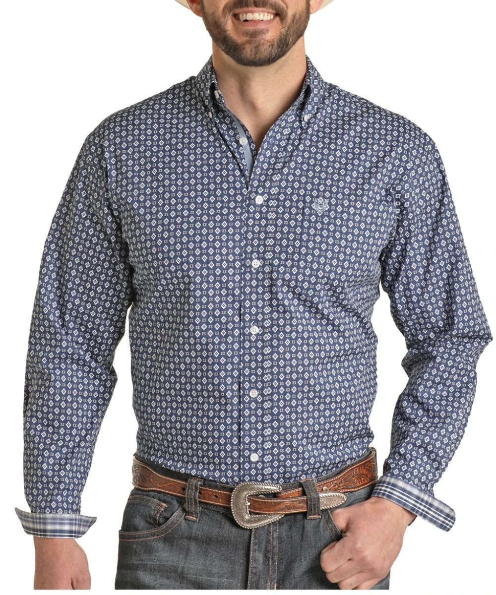 Long Sleeve; Button Down Collar, Placket, And Cuffs; Single Open Chest Pocket With Logo Embroidery; Contrast Cuffs; Color: Blue Geometric Print; Style #RSMSODR0NL