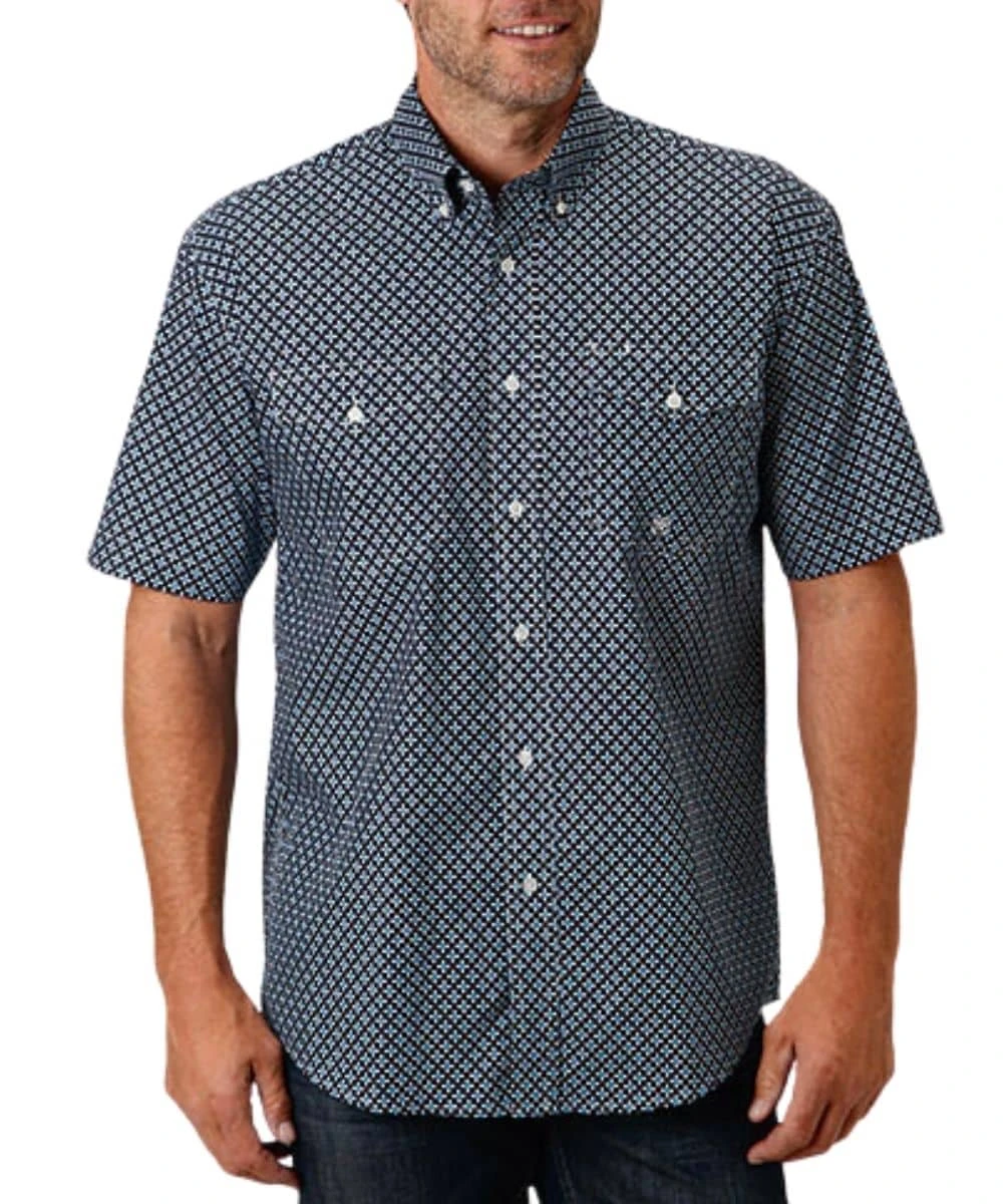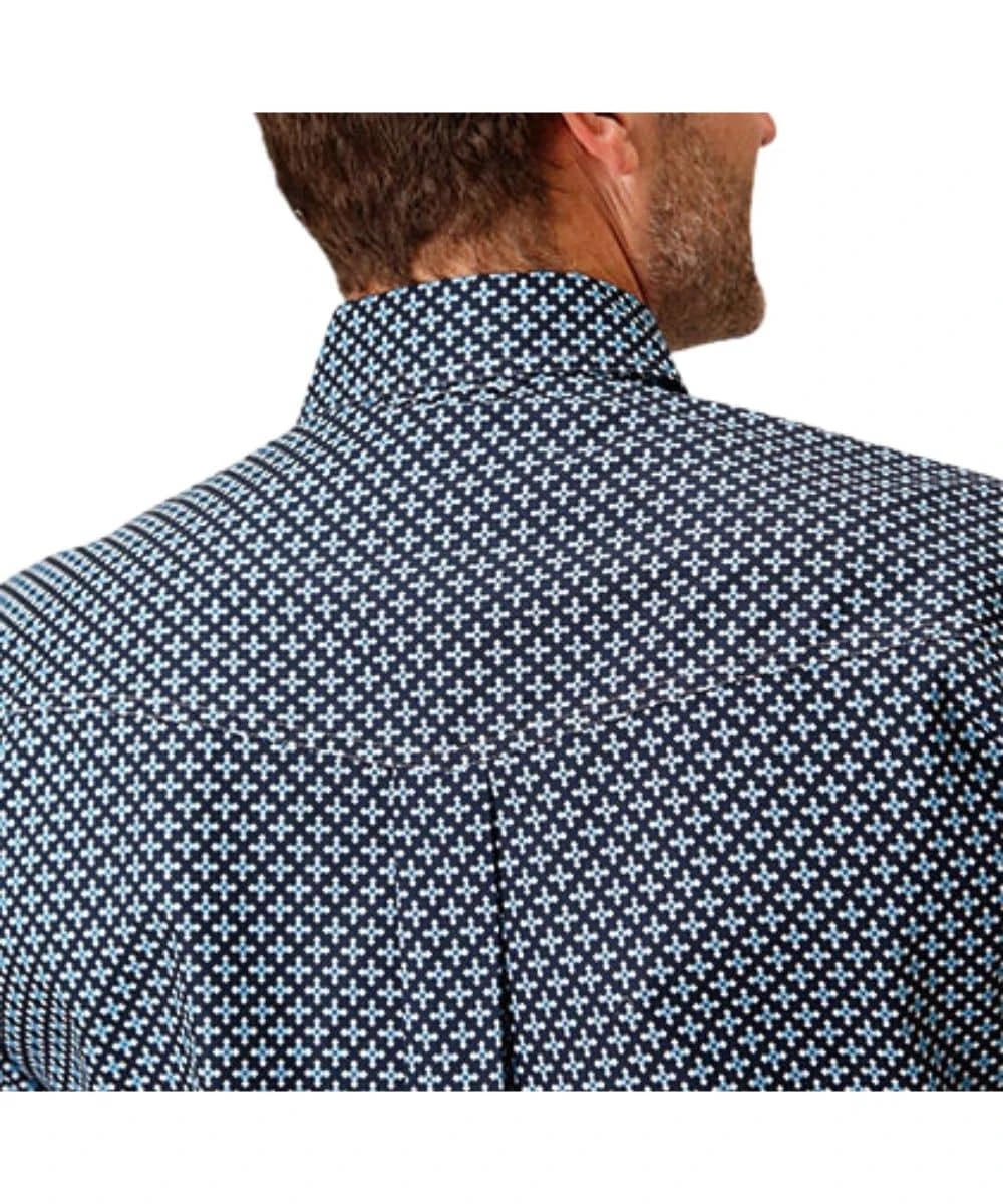 100% Cotton; Short Sleeve; Button Down Collar And Placket; Dual Single Point Button Through Flap Chest Pockets With Logo Embroidery; Single Point Back Yoke With Pleat And Locker Loop; Color: Blue Geo Print; Style #03-002-0325-2014