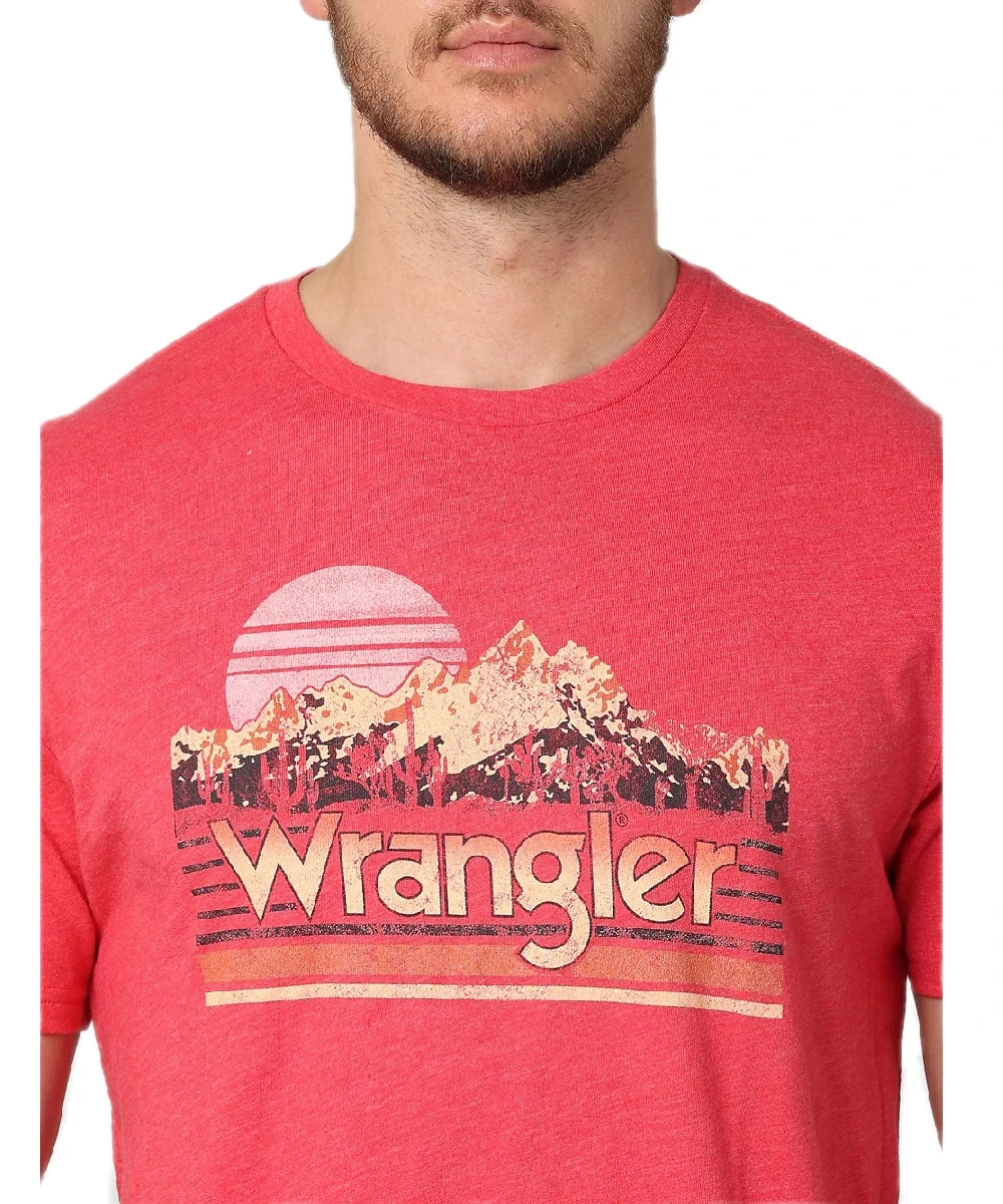50% Cotton/50% Polyester; Crew Neck; Front Graphic Tee Black, Yellow And Orange Mountain Moonrise Logo Print; Color: Red; Style #112315023